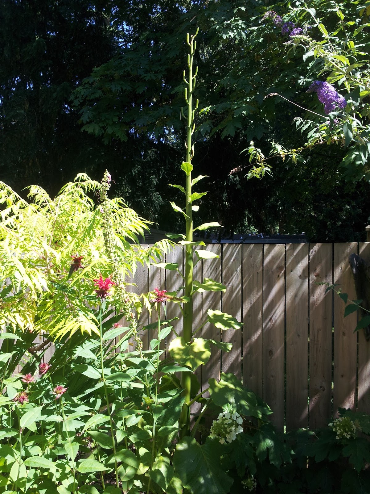 If I were a poet, I'd write an ode to Cardiocrinum giganteum (Giant Himalayan Lily). It took my breath away this year. I nicknamed it "Angel of Death" (thanks to Amanda for the idea) because of its location in the devil garden, angelic white blooms towering on high, and also because it dies after a multi-year march to flowering. Since I'm not a poet, I'm just offering some basic documentation here. I planted this bulb in 2013, it was part of the initial devil garden planting. It must have been several years old already.